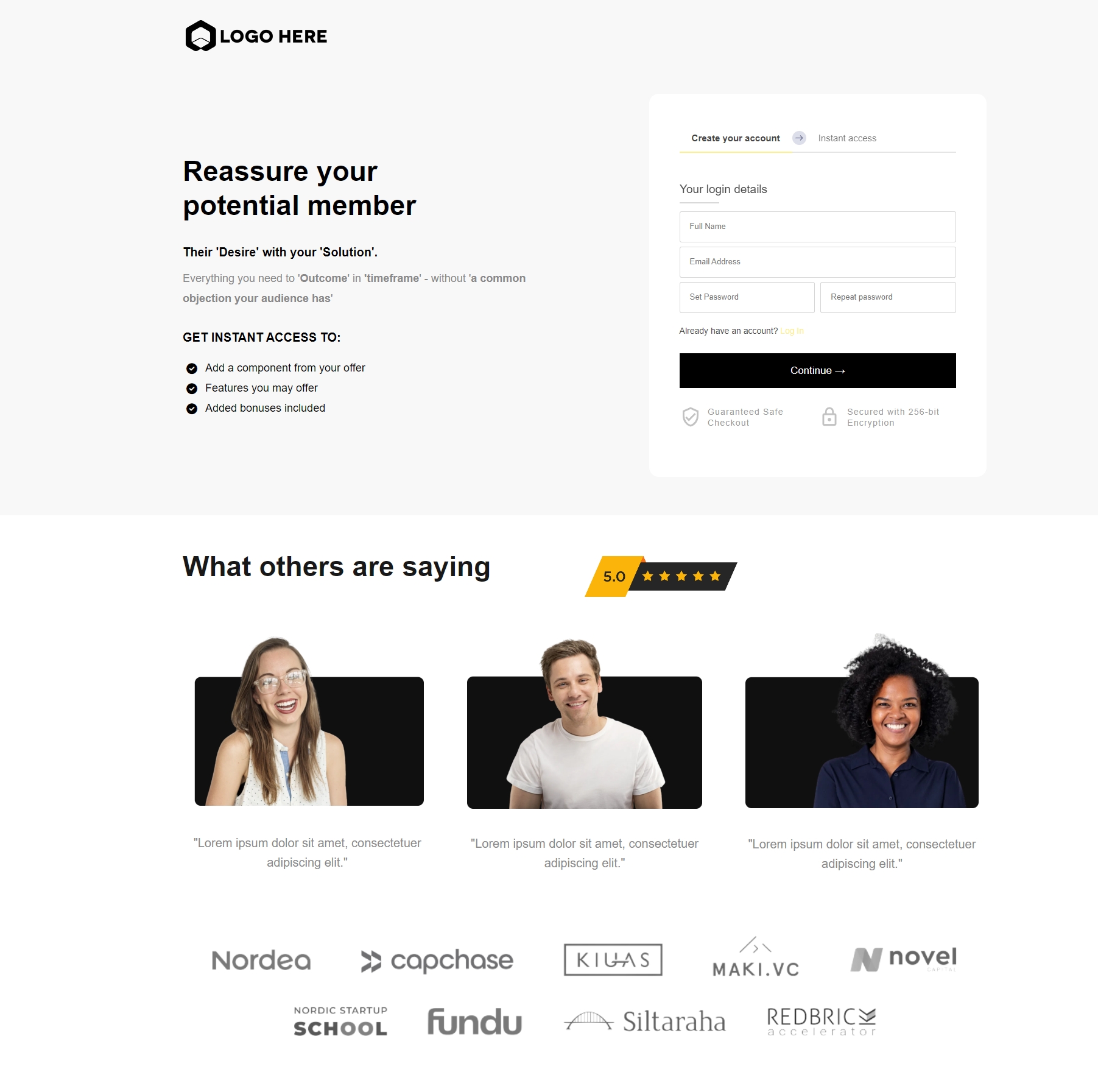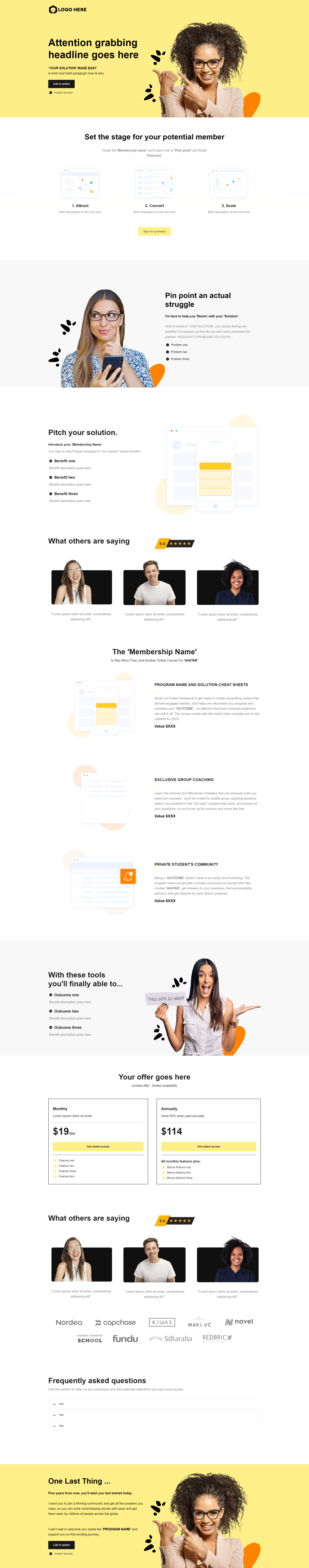 ステップ1:ランディングページ - これは見込み会員が広告やリンクをクリックしたときに最初に見るページです。ランディングページの主な目的は、訪問者の注意を引き、会員プログラムについてもっと知りたいと思わせることです。このページでは通常、会員の利点、機能、料金に関する情報が提供されます。