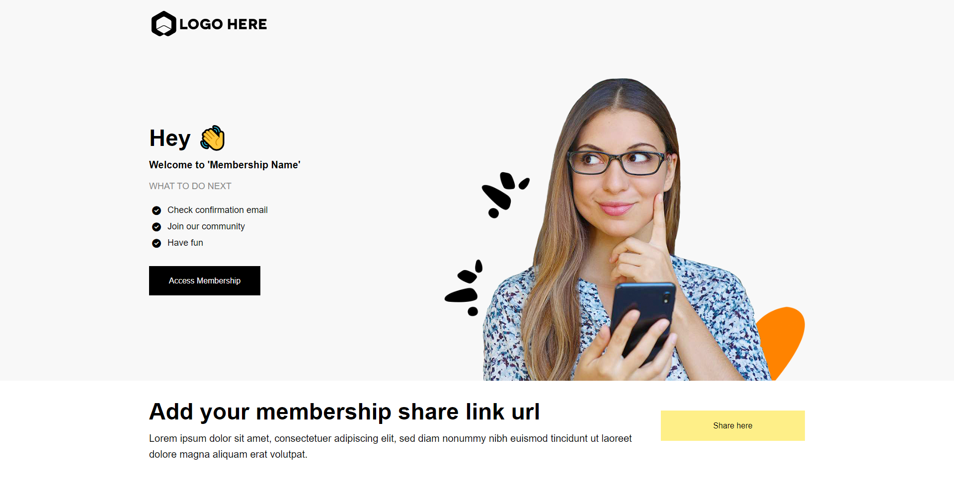 ステップ3:サンキューページ - 会員が購入を完了すると、サンキューページにリダイレクトされます。このページは会員購入を確認し、会員エリアにアクセスするための行動喚起(CTA)を提供します。