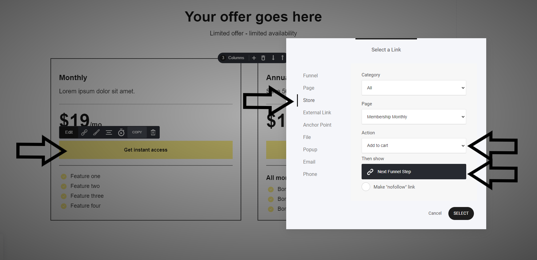 ファネルデザインのどの要素も希望に応じて完全に編集できます。必要に応じてランディングページに予約ウィジェットを追加することもできます。 訪問者が任意の ランディングページの次のステップは、商品が表示される注文ページです。