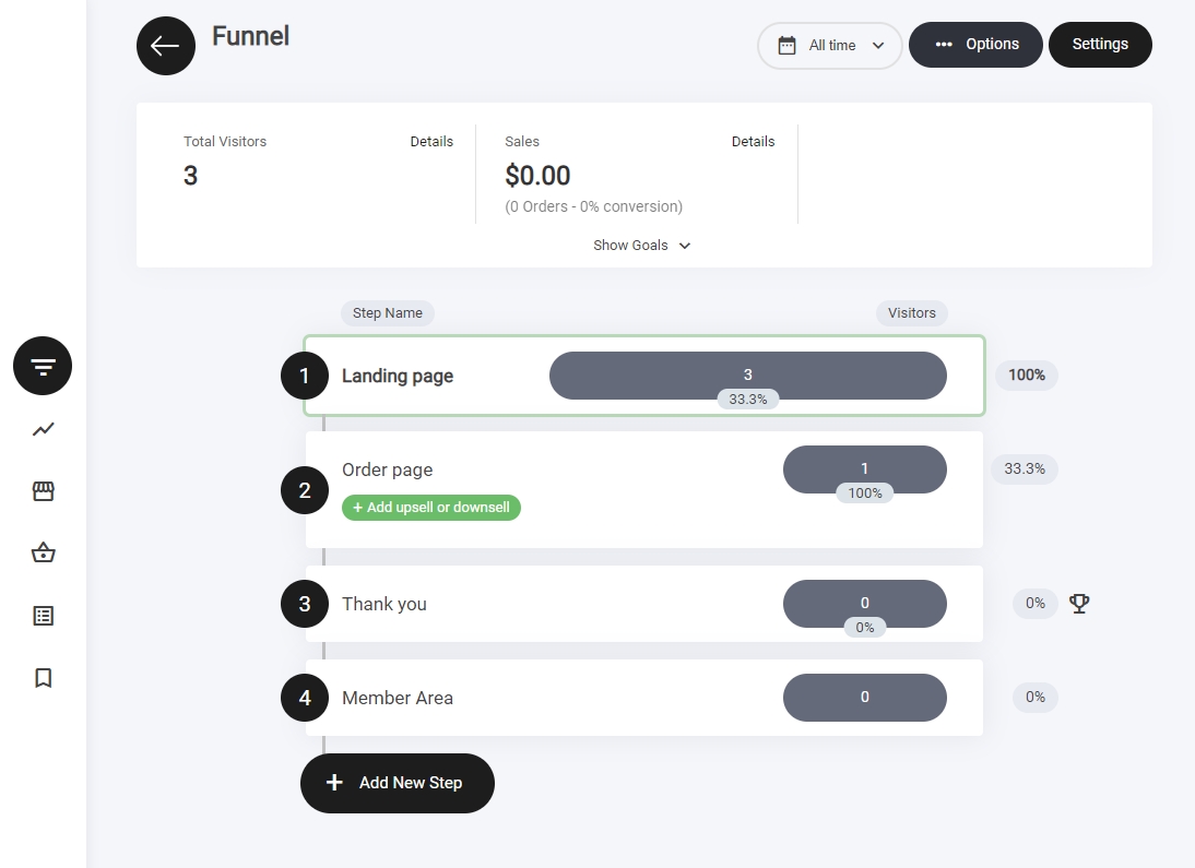 下の画像はビルダー内に表示された4ステップのファネルを示しています。ご覧の通り、機能させるために必要なすべてのステップが揃っています。