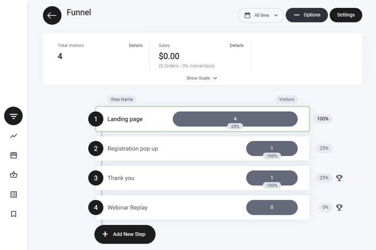 下の画像はビルダー内に表示された4ステップのファネルを示しています。ご覧の通り、機能させるために必要なすべてのステップが揃っています。