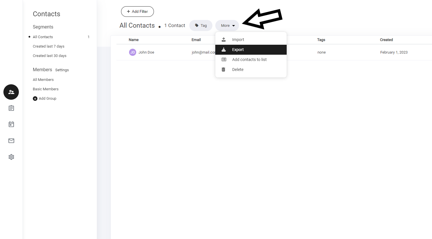 エクスポートセクション内に新しいウィンドウが開きます。連絡先をエクスポートするには「エクスポート」を選択してください。あなたの連絡先はExcelスプレッドシートに追加されます。タグから会員データまでのすべての連絡先情報が含まれます。