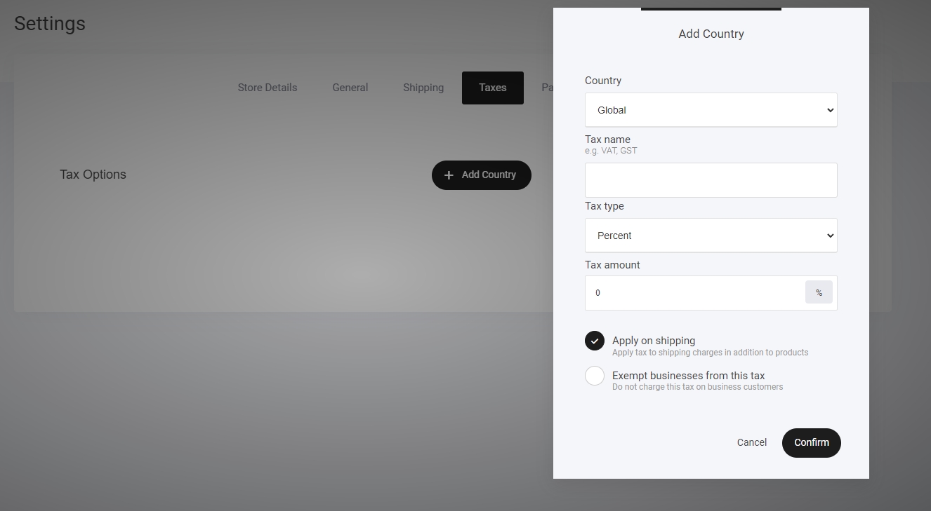 VAT、GST、またはその他の税金をEC設定で構成して、税務コンプライアンスを簡単に確保します。