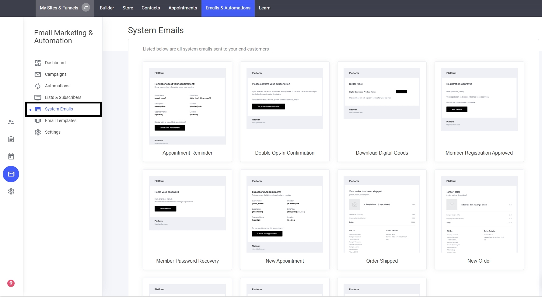 「システムメール」をクリック – 自動送信メッセージ用のテンプレートを見つけます。
