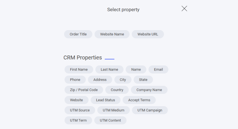 また、すべてのCRM プロパティ もメールに追加できます。作成したカスタムプロパティがある場合、それらもここに一覧表示されます。