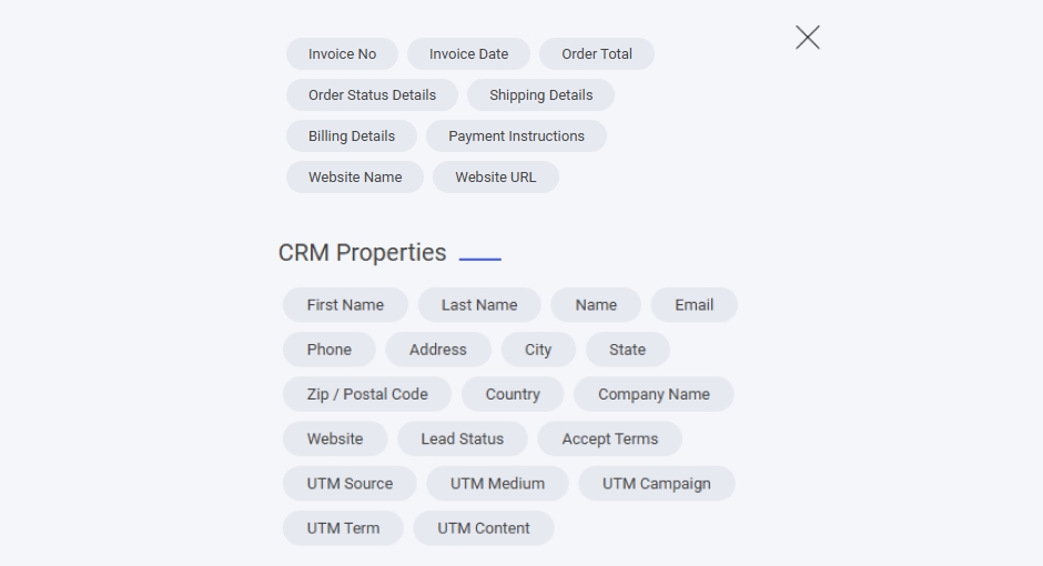 また、すべてのCRM プロパティ もメールに追加できます。作成したカスタムプロパティがある場合、それらもここに一覧表示されます。