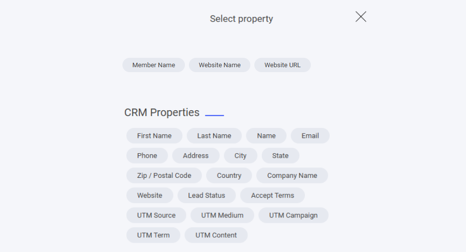 また、すべてのCRM プロパティ もメールに追加できます。作成したカスタムプロパティがある場合、それらもここに一覧表示されます。
