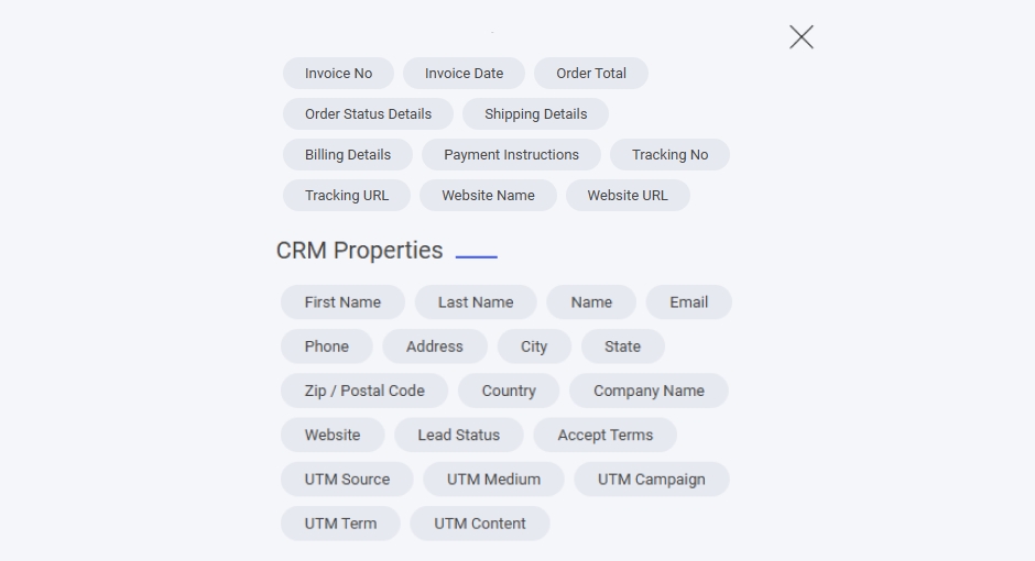 また、すべてのCRM プロパティ もメールに追加できます。作成したカスタムプロパティがある場合、それらもここに一覧表示されます。