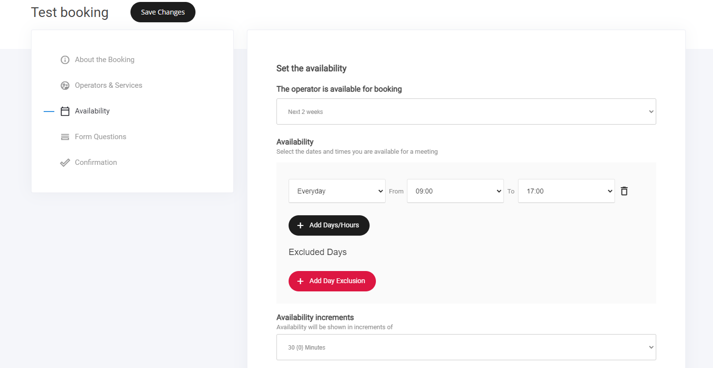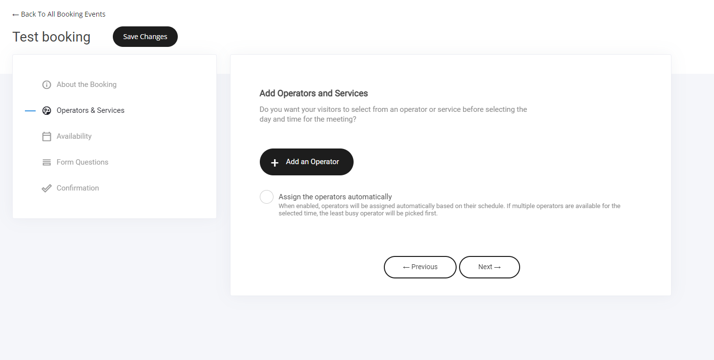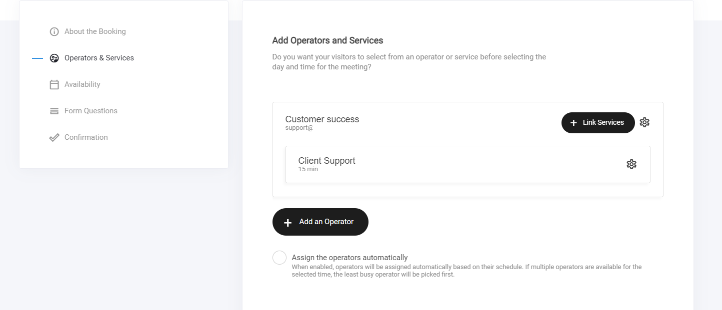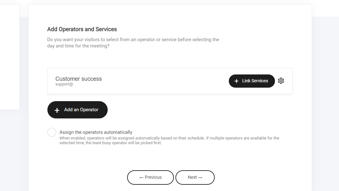 オペレーターはミーティング/イベントを実施する担当者です。必要に応じて複数のオペレーターを追加できます。サービスは任意です。例えばサービスは異なる種類のミーティングや予約タイプを指します。例として2つの予約サービスは「15分のビデオ通話」と「対面ミーティング」などです。