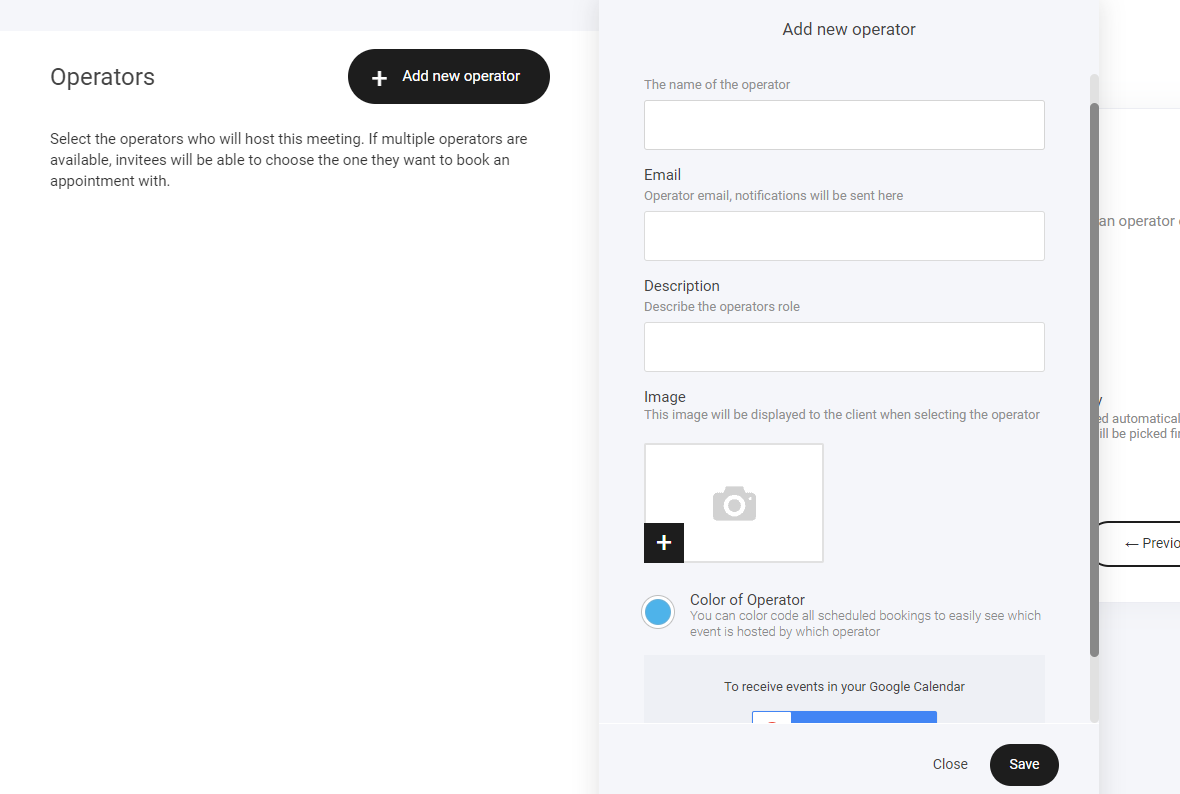 オペレーターの詳細を入力します。各オペレーターには表示を助けるために色を割り当てることができます。また、各オペレーターのすべての予約を受信して自分のGoogleカレンダーに直接追加することも可能です。