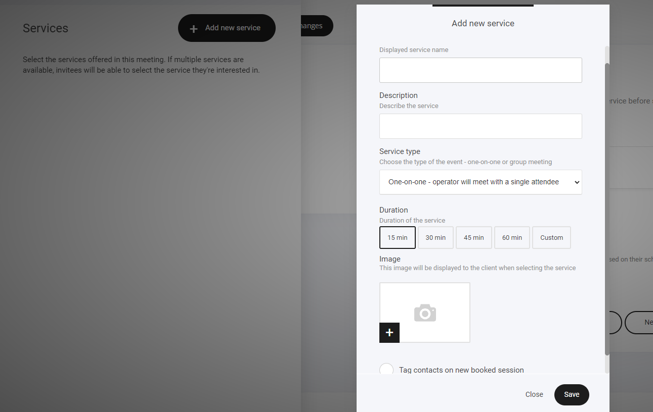 「新しいサービス追加」ポップアップの必須項目を入力します。また、1対1のミーティングにするか複数人にするかを選択します。例えばオンラインウェビナーで50席のみ利用可能などの場合です。所要時間を設定すれば完了です。