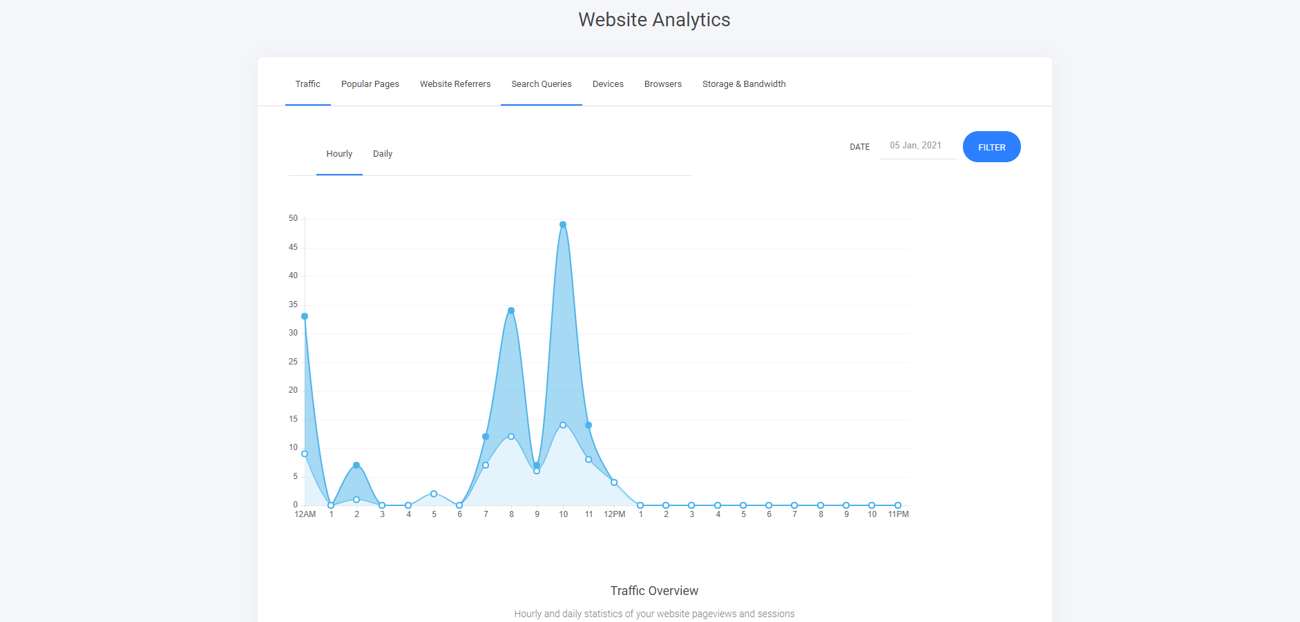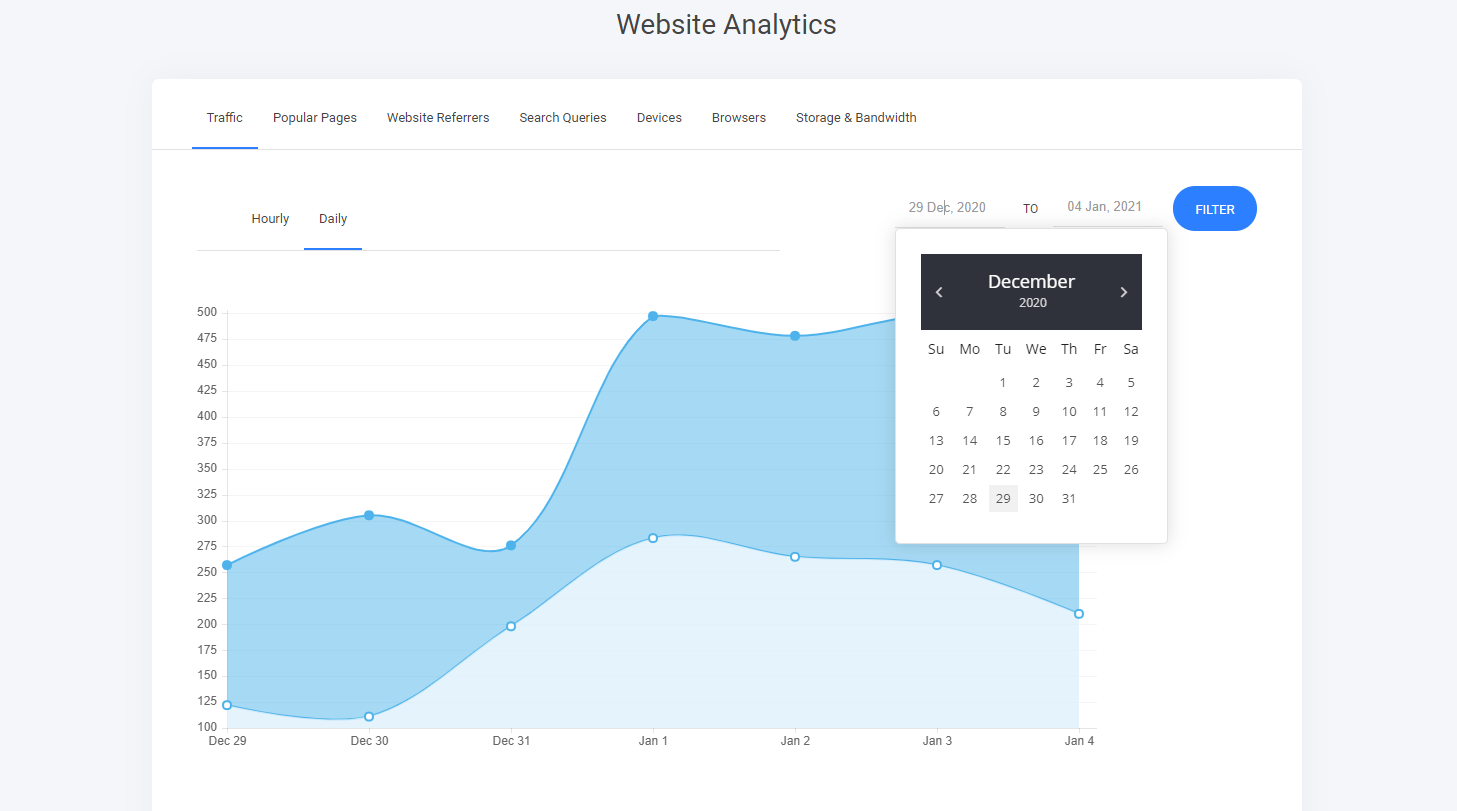 すべてのページの時間別/日別のウェブサイトトラフィックを確認します。日別タブを選択し、右側の日時タブで日付範囲を設定することで、トラフィックと訪問者に関してサイトで何が起きているかを全体的に把握できます。