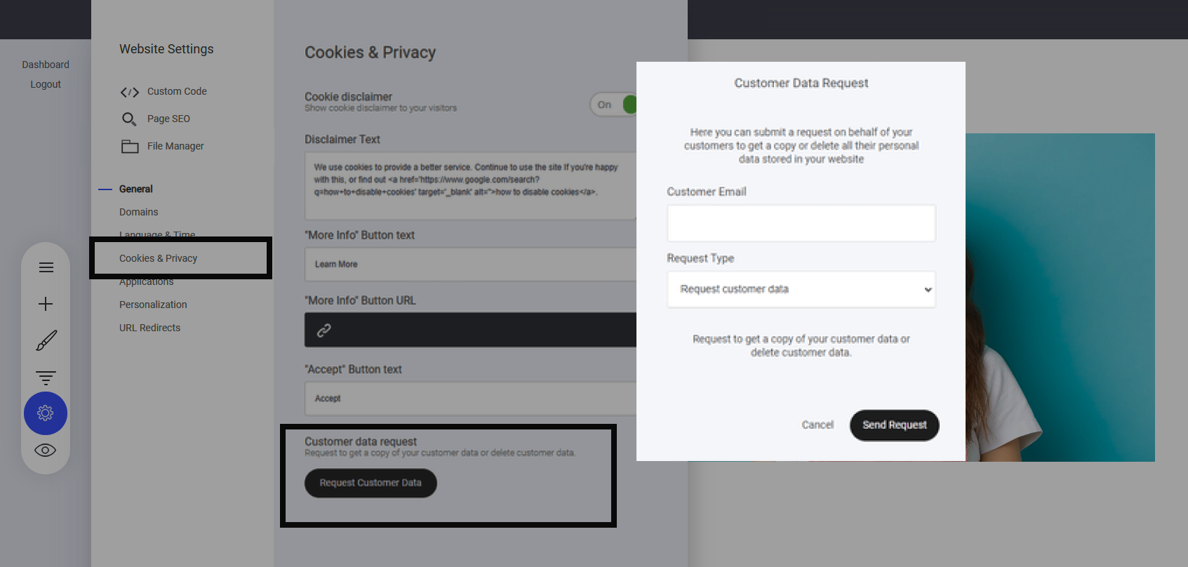 ウェブサイト設定へ移動 > クッキーとプライバシー > 顧客データを請求する (ページ下部)。