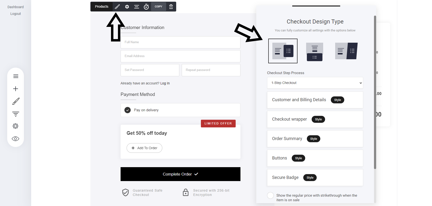 チェックアウトのステッププロセス:チェックアウトのステッププロセスでは、1ステップ、2ステップ、場合によっては3ステップのチェックアウトプロセスから選択できます。