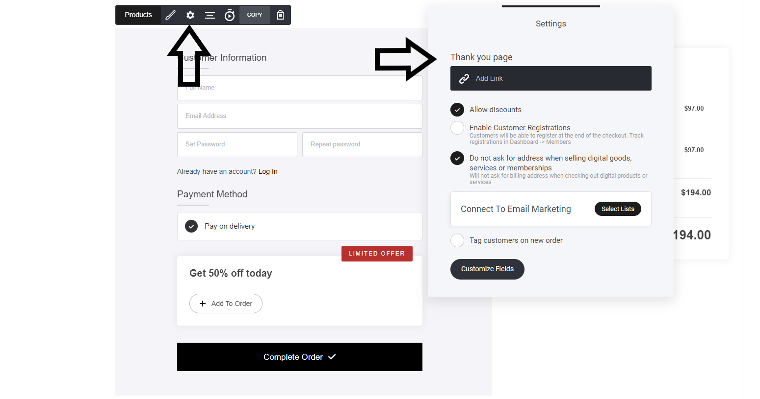サンキューページ: 顧客がチェックアウトでストアアイテムを購入したとき、どこに送信しますか。カスタムのサンキューページ、ウェブサイト内の任意のページ、ファネルの任意のステップ、さらにはFacebookグループのような外部URLなどに送ることができます。