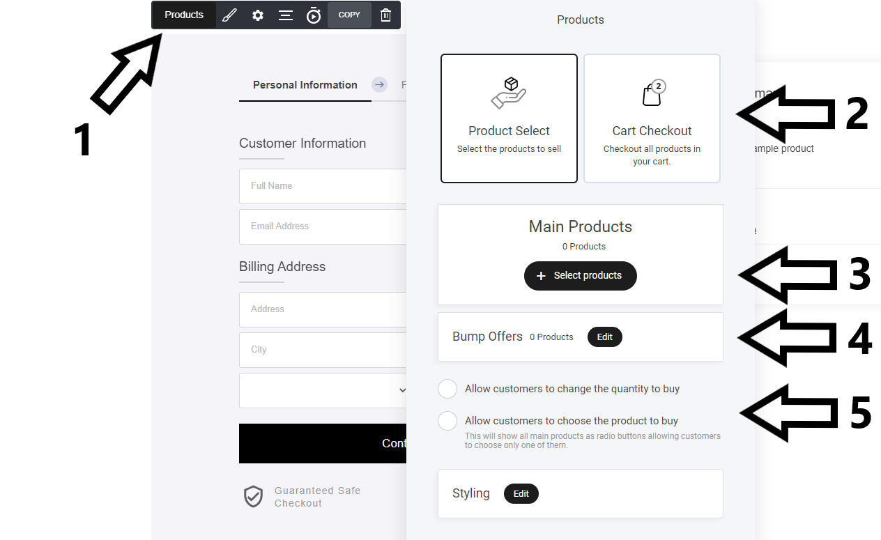 チェックアウトをページに配置したら、次のステップは以下のステップ1で強調表示された「製品」タブを選択することです