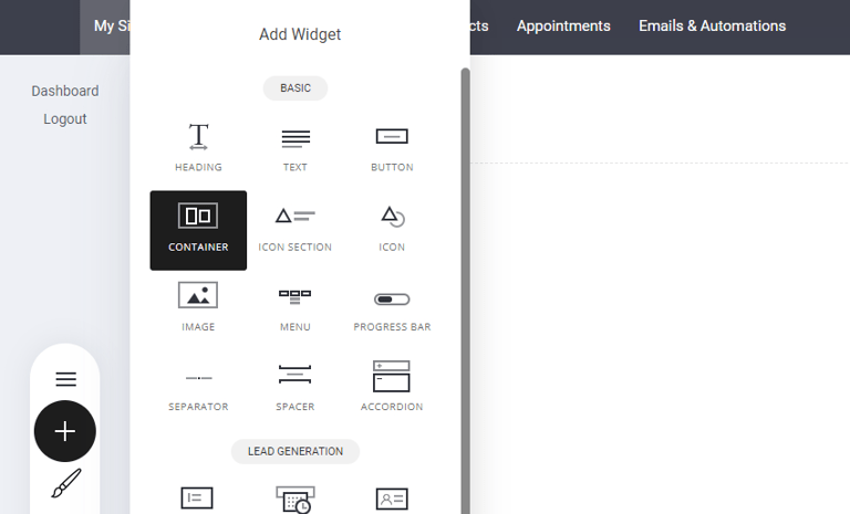 「コンテナ」を選択 – を見つけます コンテナウィジェット をページに追加します。