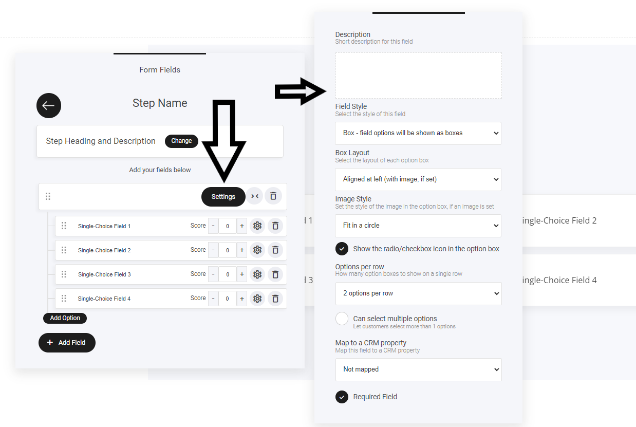 以下にハイライトされたクイズフィールドの設定ギアは、ステップの見出しと説明を編集し、フォントや色のスタイリングを含めて調整することを可能にします。