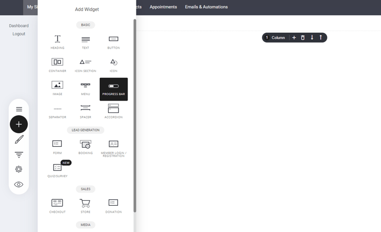 「プログレスバー」を選択します – リアルタイムトラッキングのためにページに追加します。
