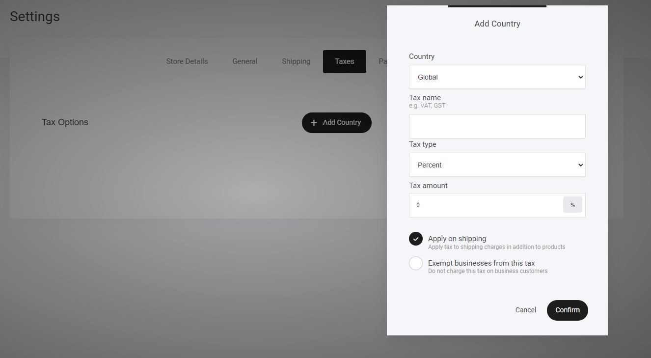 Click "Add Country" – Select the regions where tax rules need to apply.