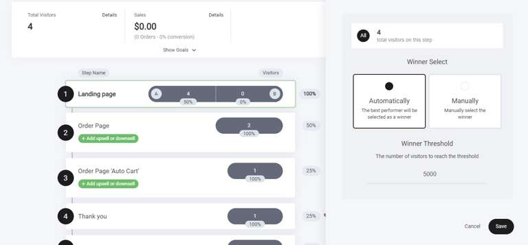 The great feature of our funnels is the actual flexibility it gives you to help enhance your conversions, whether that be manually selecting the winning side or letting the funnel automation take over and optimize it for you.