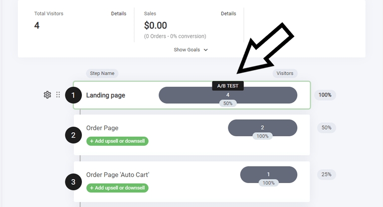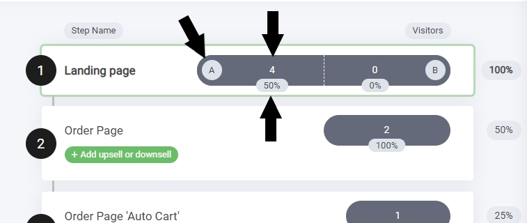 The split test bar will display both steps A & B or simply put. Page one and Page two. Within the bar you will see a variety of numbers, these are your analytics that cover both how many people visited each side of the funnel step and also conversion %. Meaning how many people visited the funnel step and moved to the next.