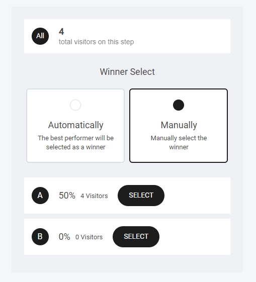 When selecting the Manual winner option you can select a winner by simply clicking the Select button, this basically means: When the funnel step reaches a certain visitors, I want to manually select the winning side based on the visitor or conversion rate.