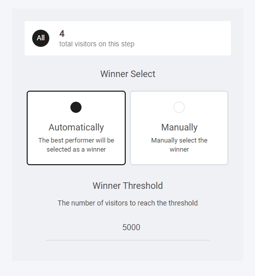 When selecting the automatic winner option you can add a winner threshold number, this basically means: When the funnel step reaches a certain visitors, I want you to automatically select the winning side that has most conversions.