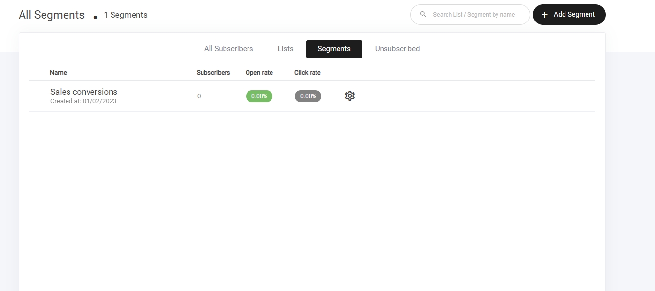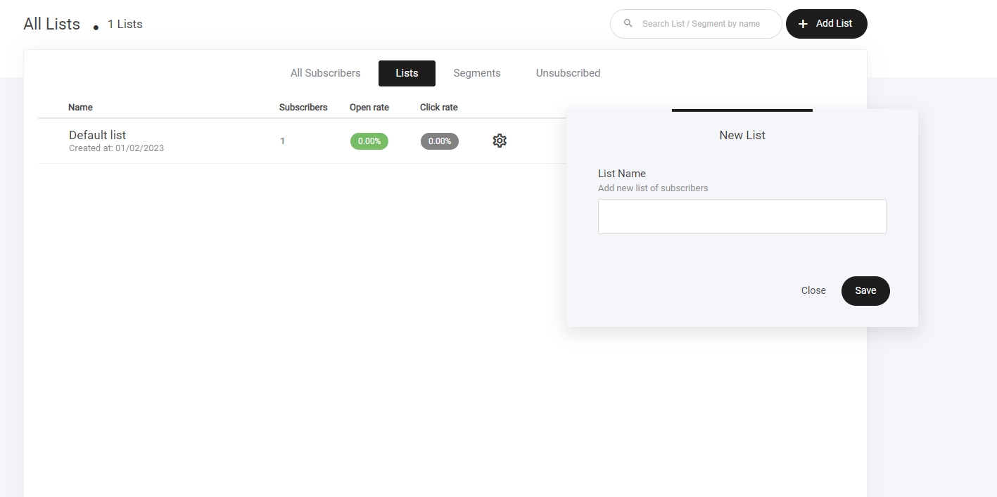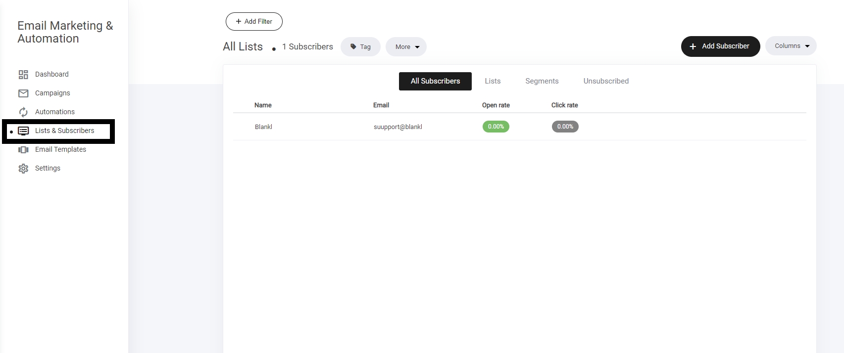 The Lists and Subscribers tab gives full control over your audience management, helping you segment and engage effectively.