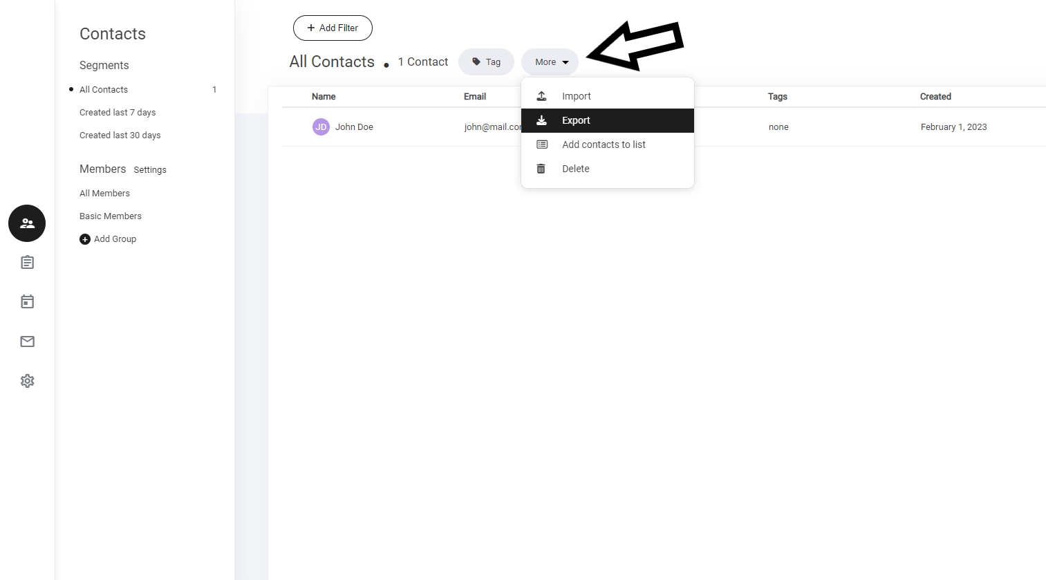 Now a new window will open within the export section. To export your contacts - select export. Your contacts will now be added to your excel spreadsheet. Including all contact details from tags to membership data.