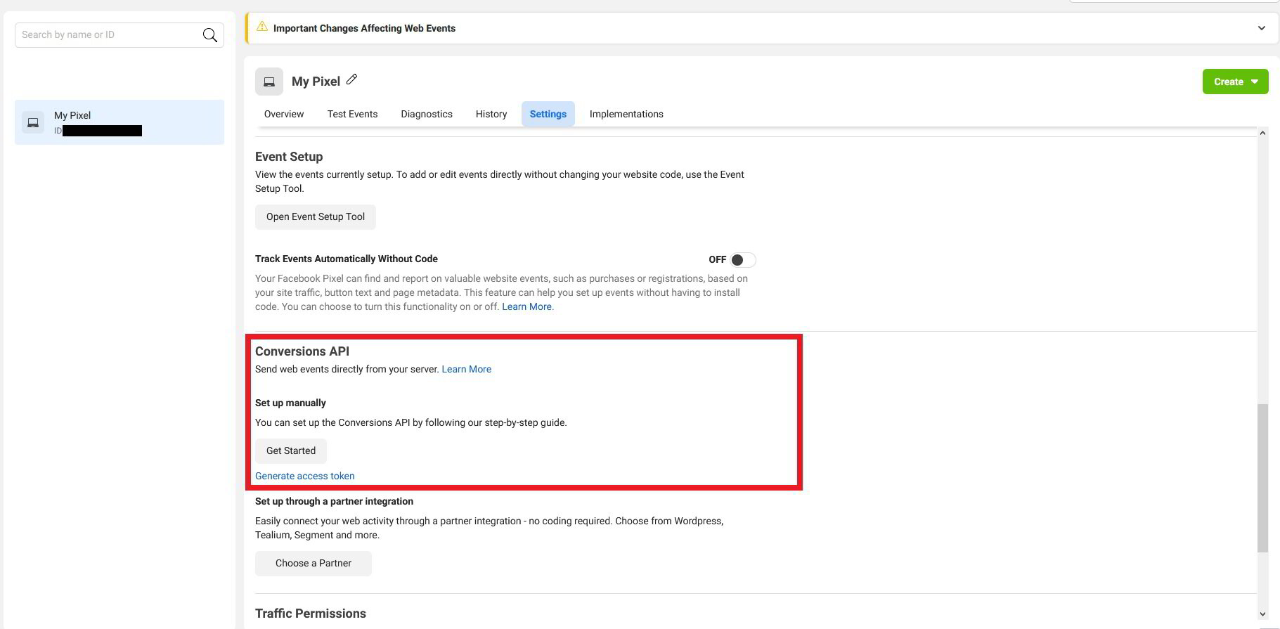 You will be prompted to enter an Access Token to use with the API. To obtain one, visit your Facebook Pixel, go to Settings and scroll down to the Conversions API area. under "set up manually" you should click on Get Started or Generate Access Token. Copy the generated token and paste it into your website settings: